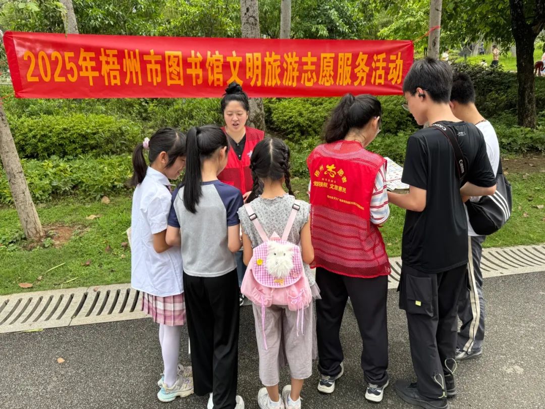 为营造文明、和谐的旅游环境,提升市民游客的文明旅游意识,5月1日,梧州市图书馆组织志愿者走进梧州市玫瑰湖公园开展“书香伴旅途 文明共守护”文明旅游志愿服务活动,旨在让阅读之花与文明之花在旅途中绽放。