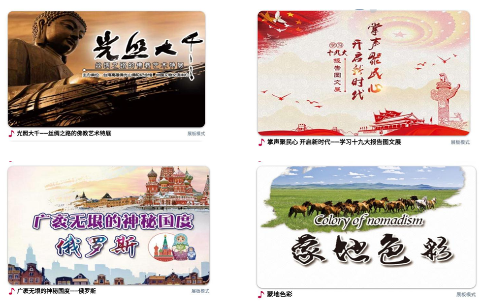 为了解决展览在空间、时间上的限制,梧州市图书馆特别引进神州共享(北京)文化传媒有限公司看展览数字阅读资源,优秀的展览资源通过互联网走入千家万户,打破了时间与空间的双重限制,带你重踏西汉时期的丝绸之路,探索中国古代贸易史,从丝绸之路穿越到十九大的人民大会堂,高举中国特色的社会主义旗帜;从俄罗斯神圣庄严的红场,来到辽阔无际的内蒙草原... ...