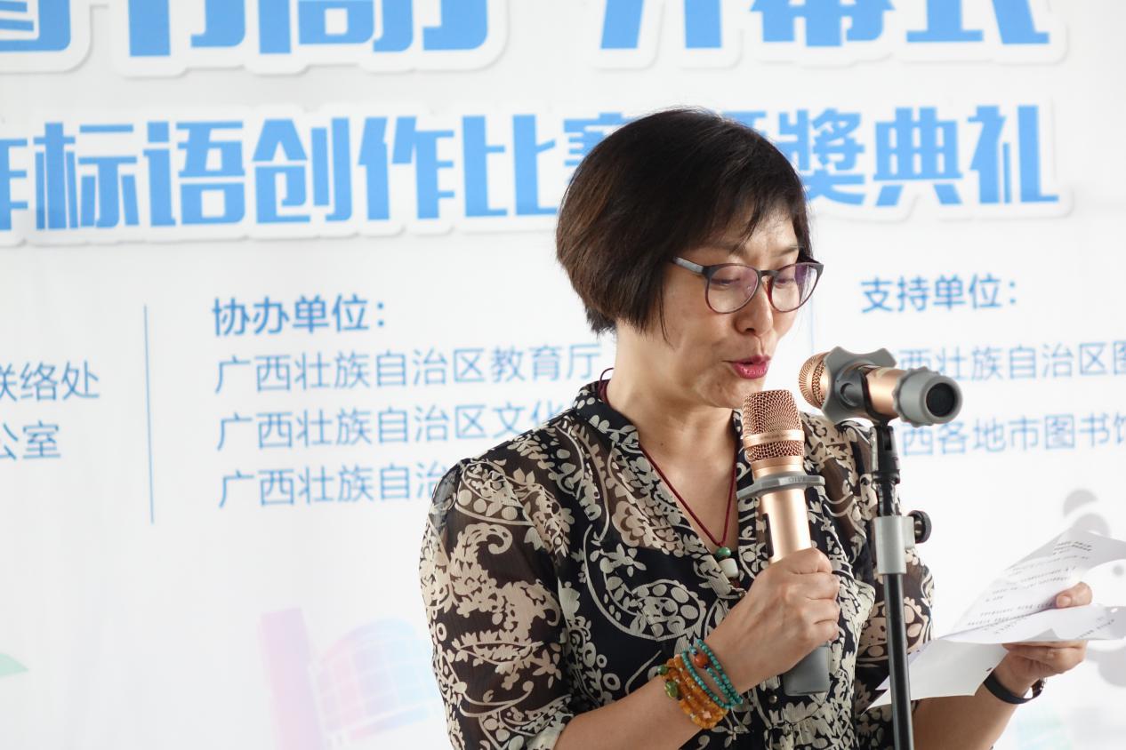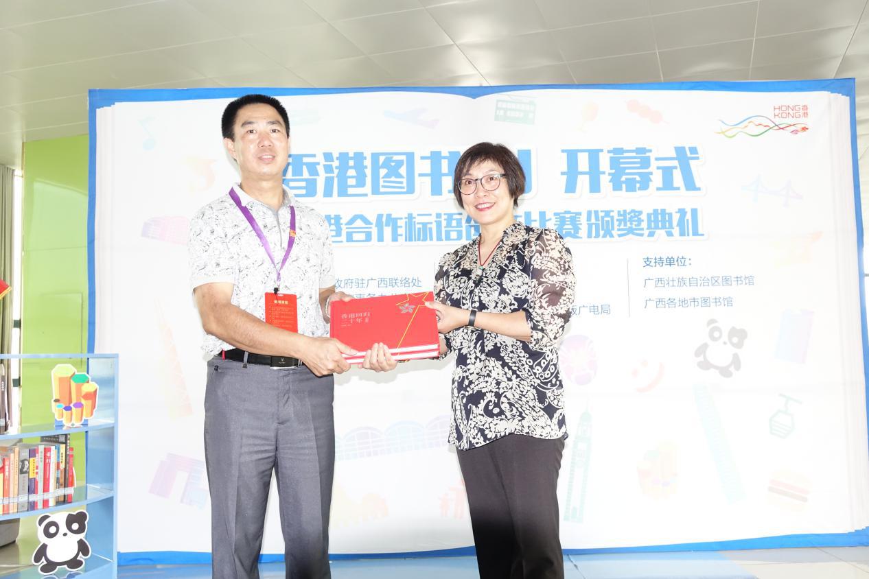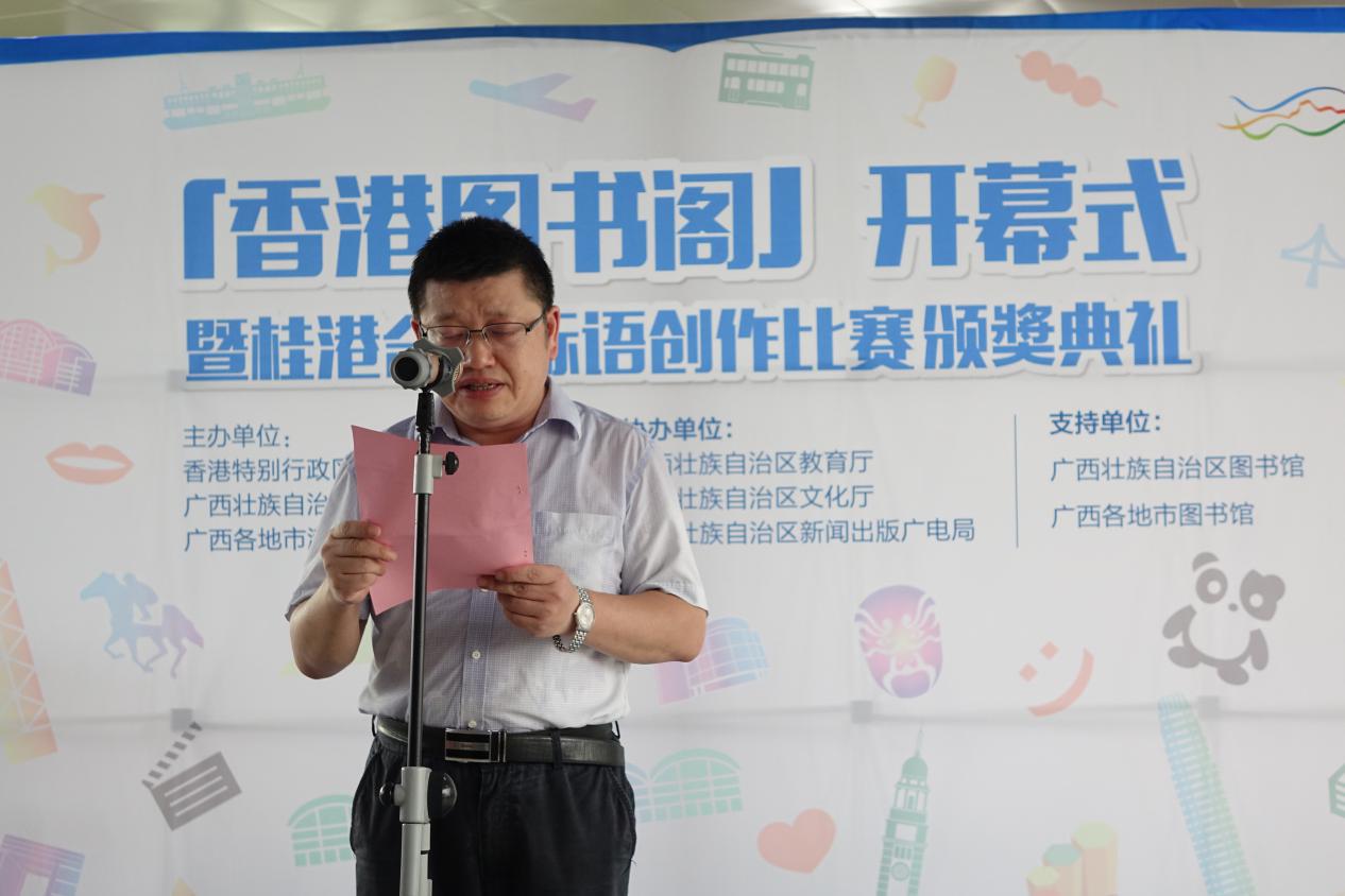 今天在梧州市图书馆举行的「香港图书阁」开幕式及桂港合作标语创作比赛颁奖典礼得到梧州市多个单位的大力支持,梧州市副市长徐文伟及香港特别行政区政府驻广西联络处卢咏斯主任分别致辞,梧州市教育局、文化新闻出版广电局、梧州市图书馆等领导出席,并向得奖学生颁发奖项。